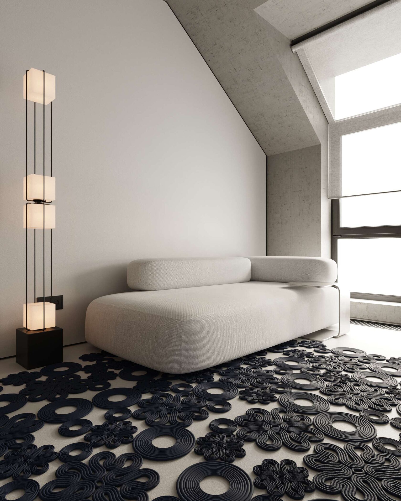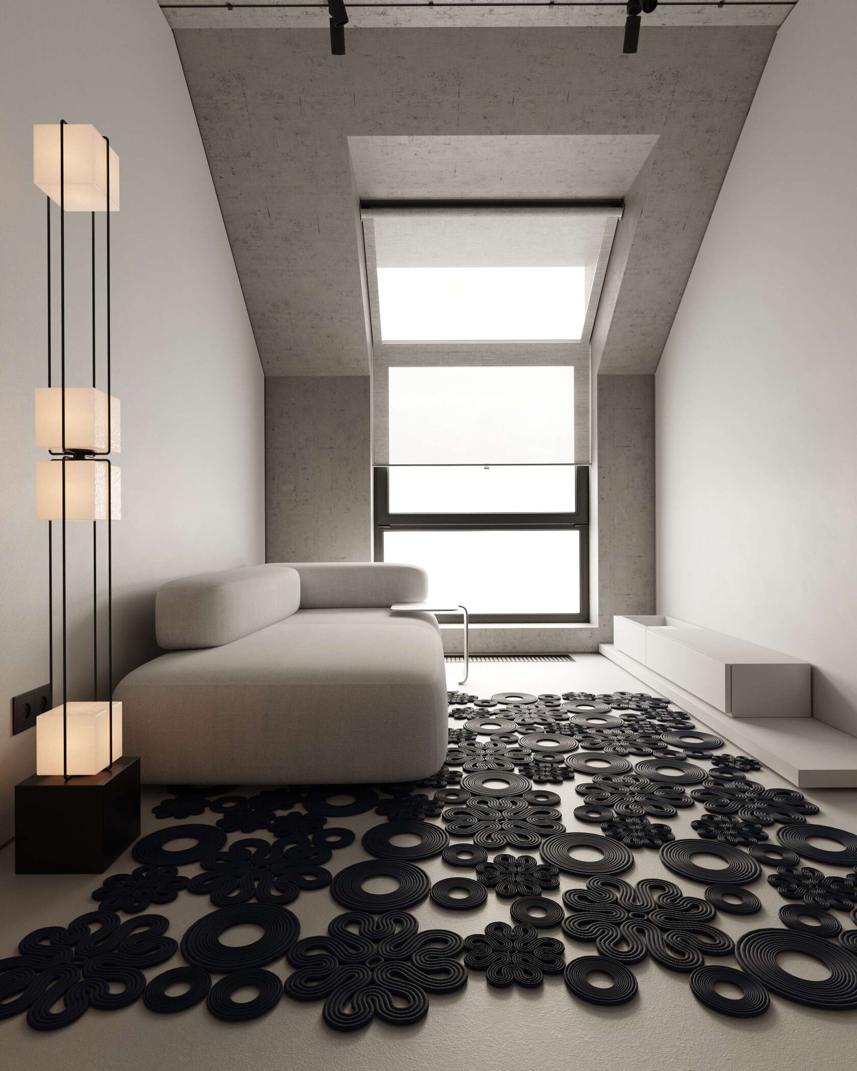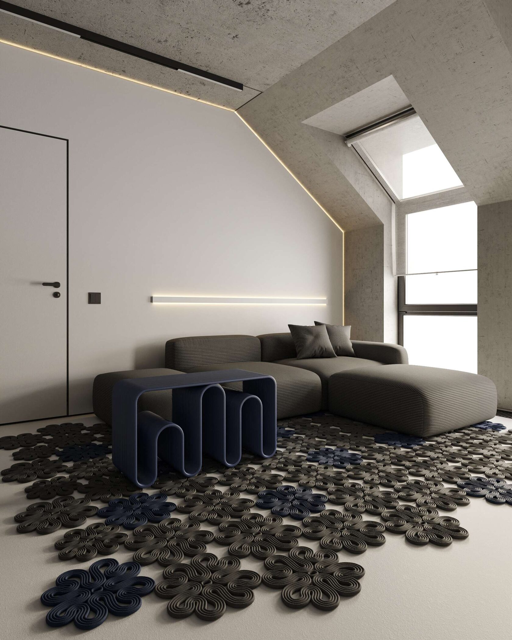 В гостиной бетонный потолок подчеркивает брутальность,