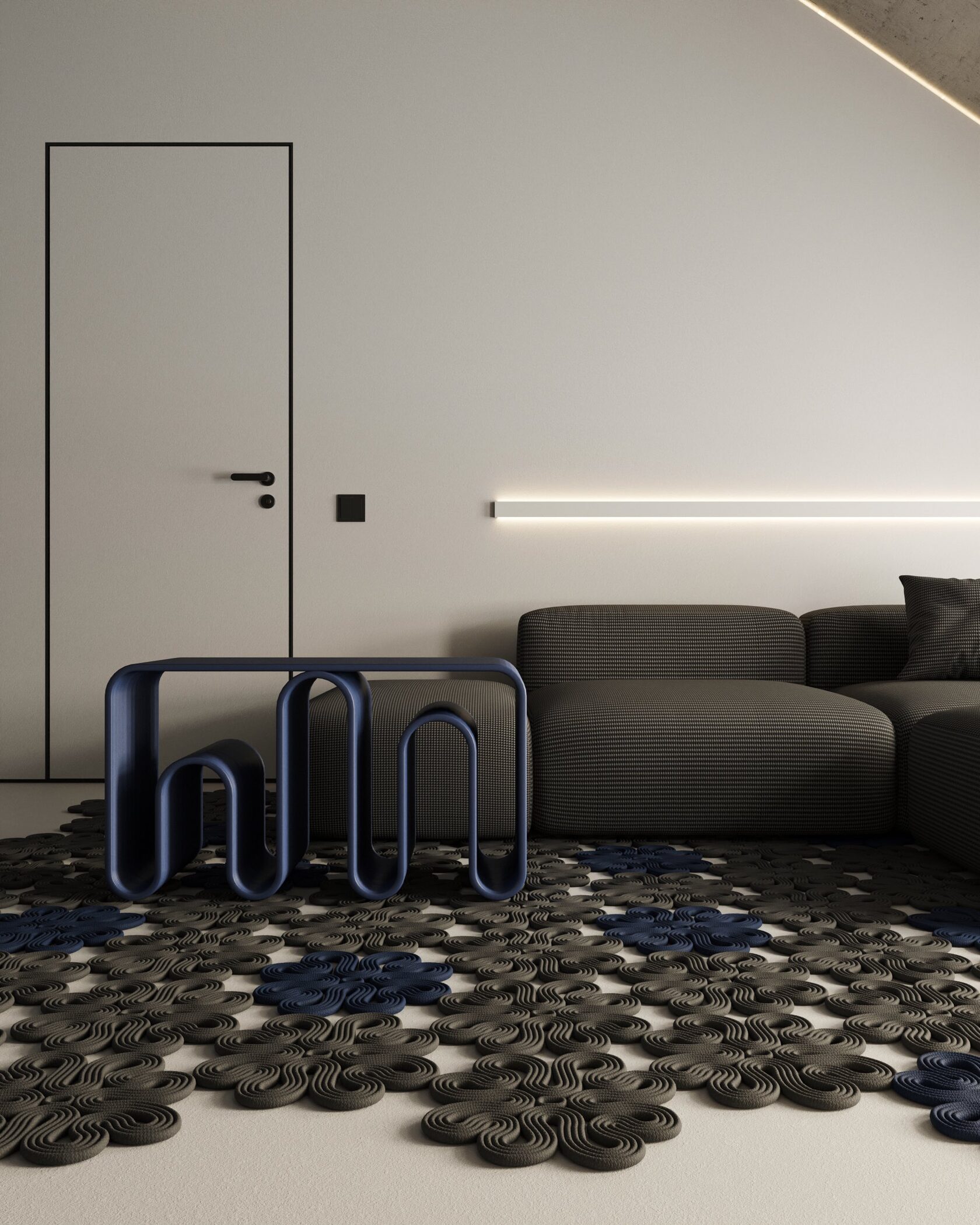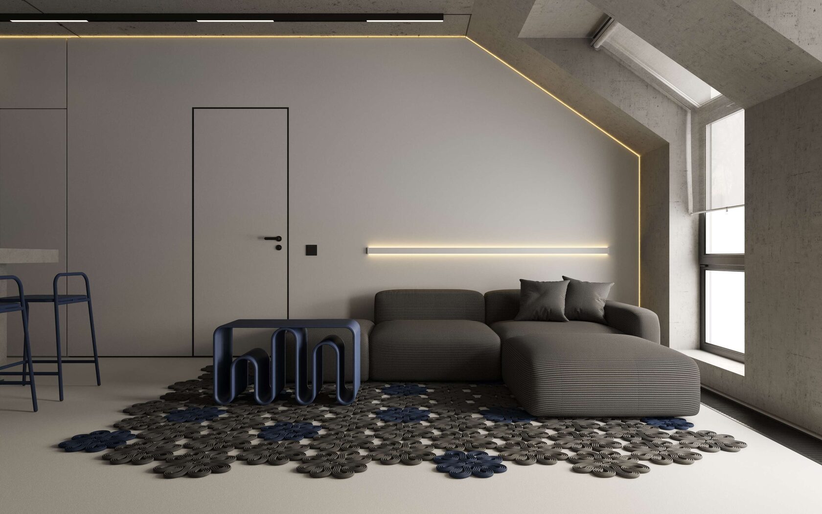 а «гусиная лапка» дивана и синие акценты мебели добавляют выразительности. Контурная RGB