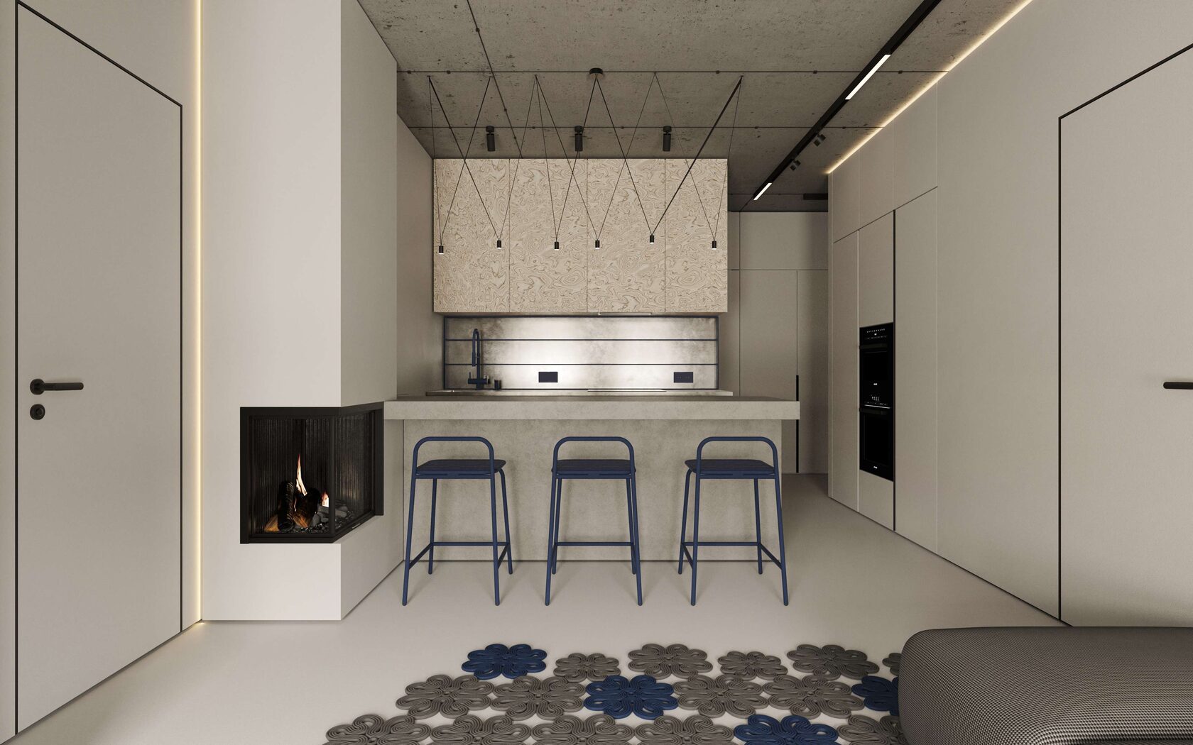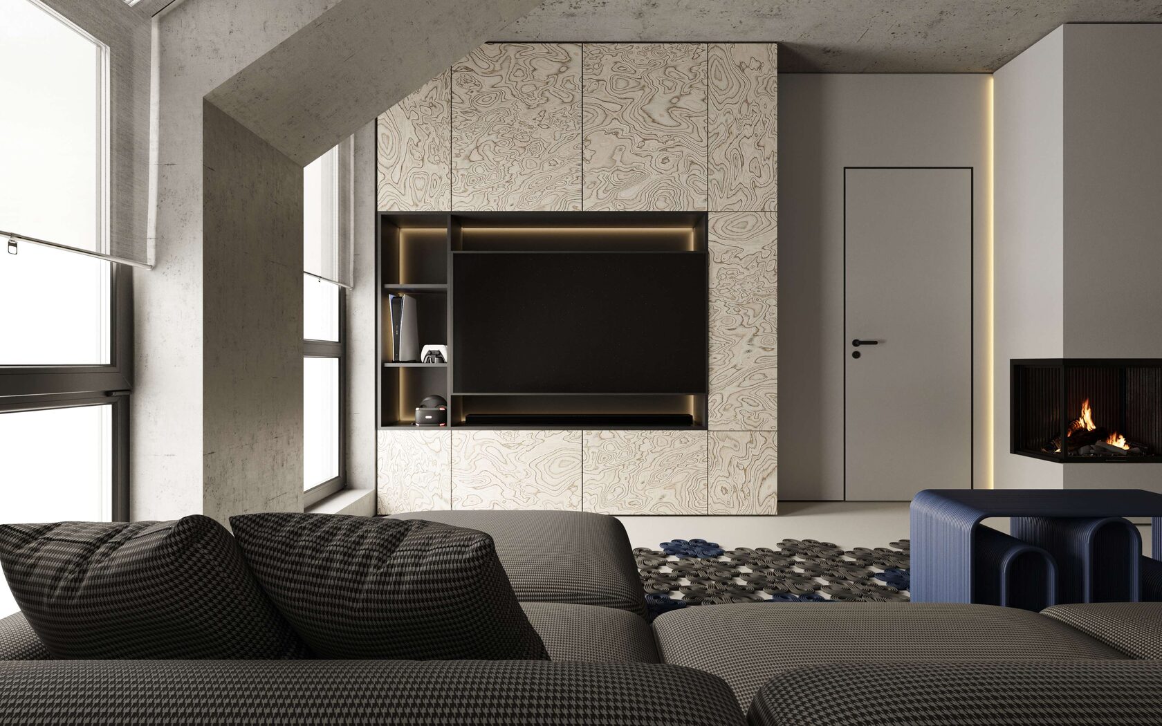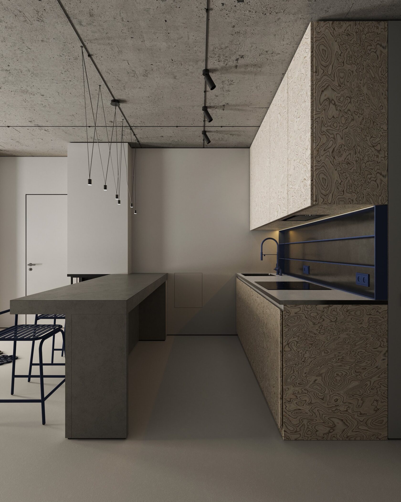 роцементе. Использование шпона и синих деталей делает интерьер стильным и гостеприимным.