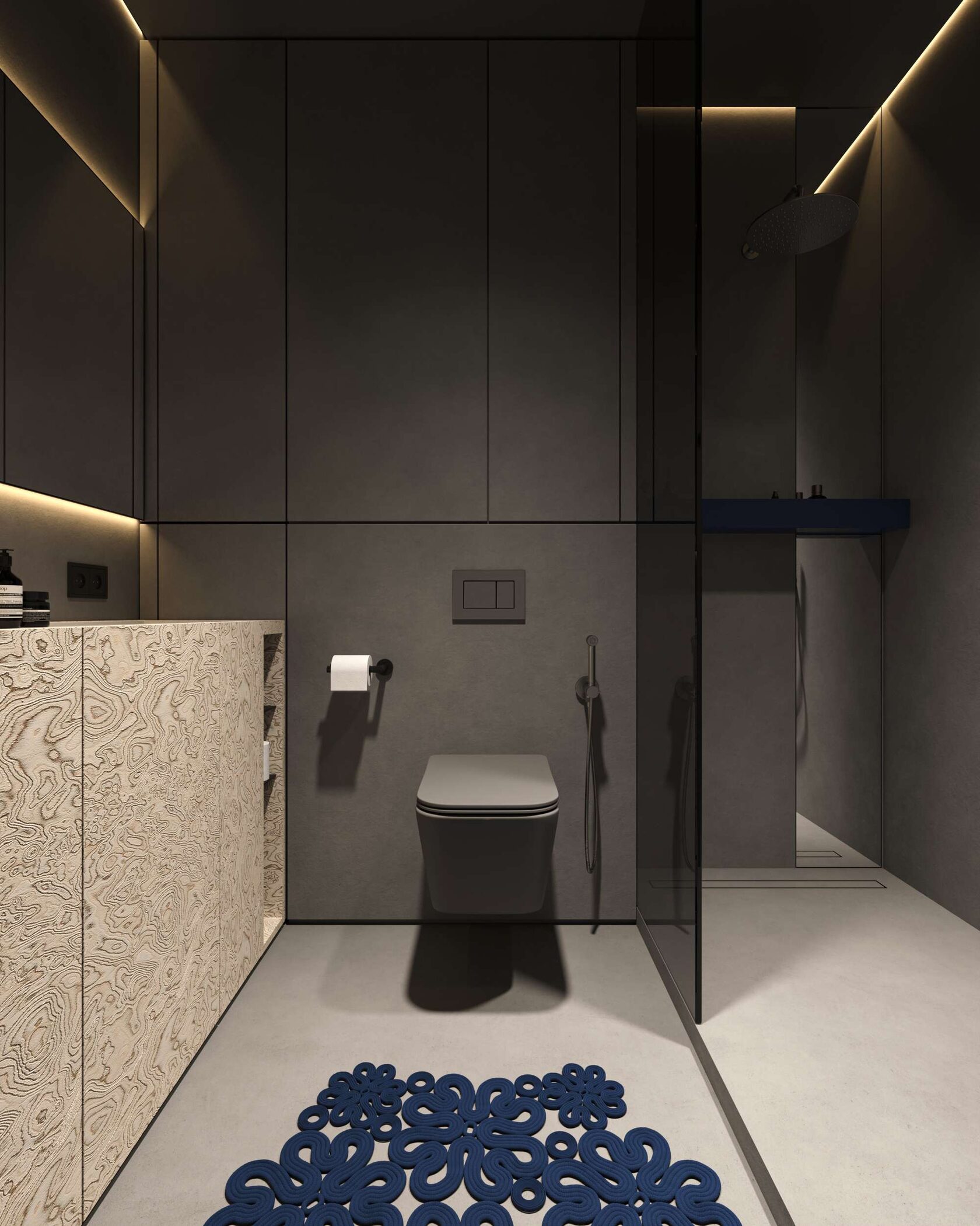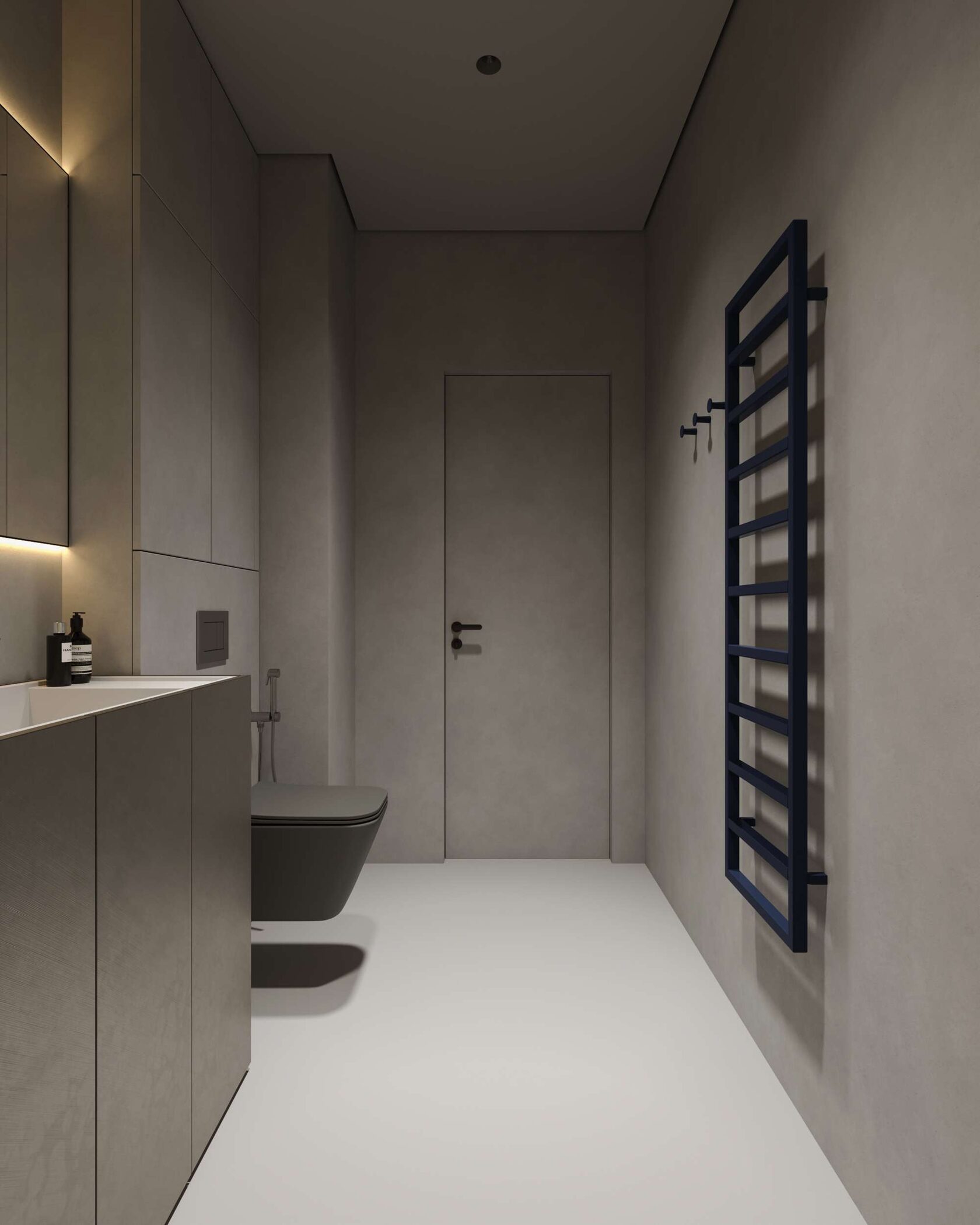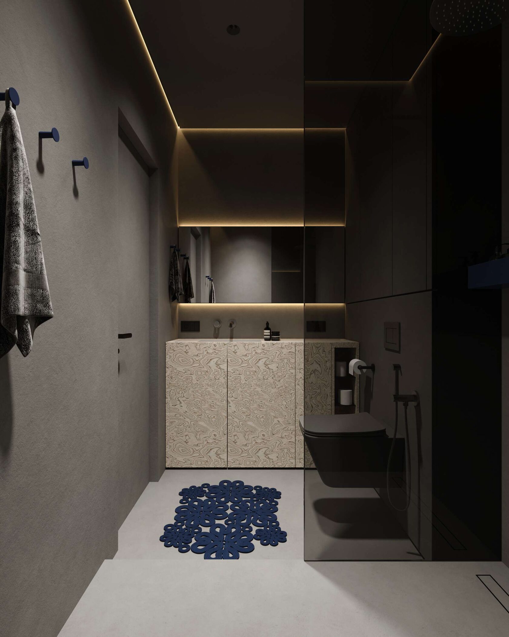 Ванная комната полностью отделана микроцементом, что