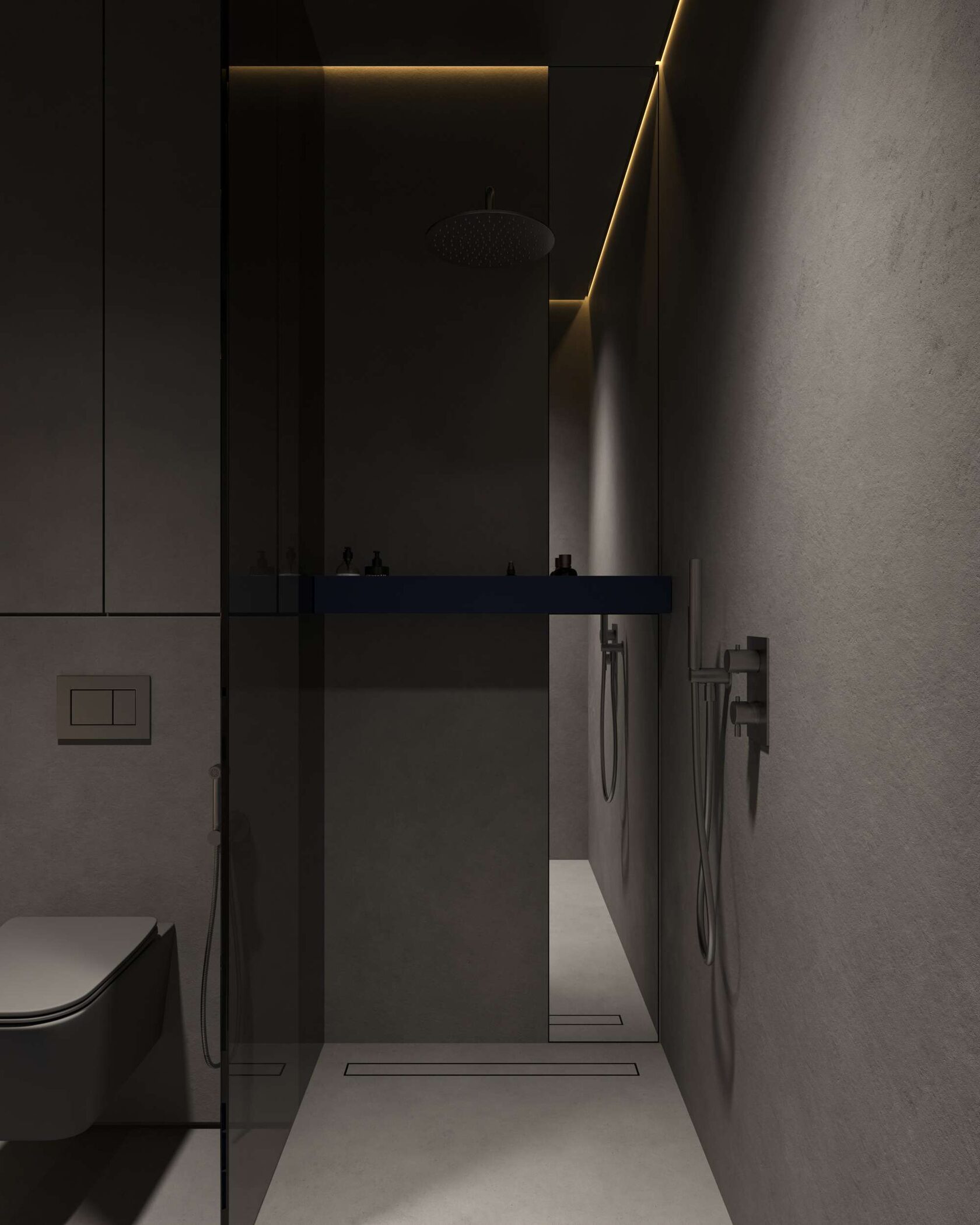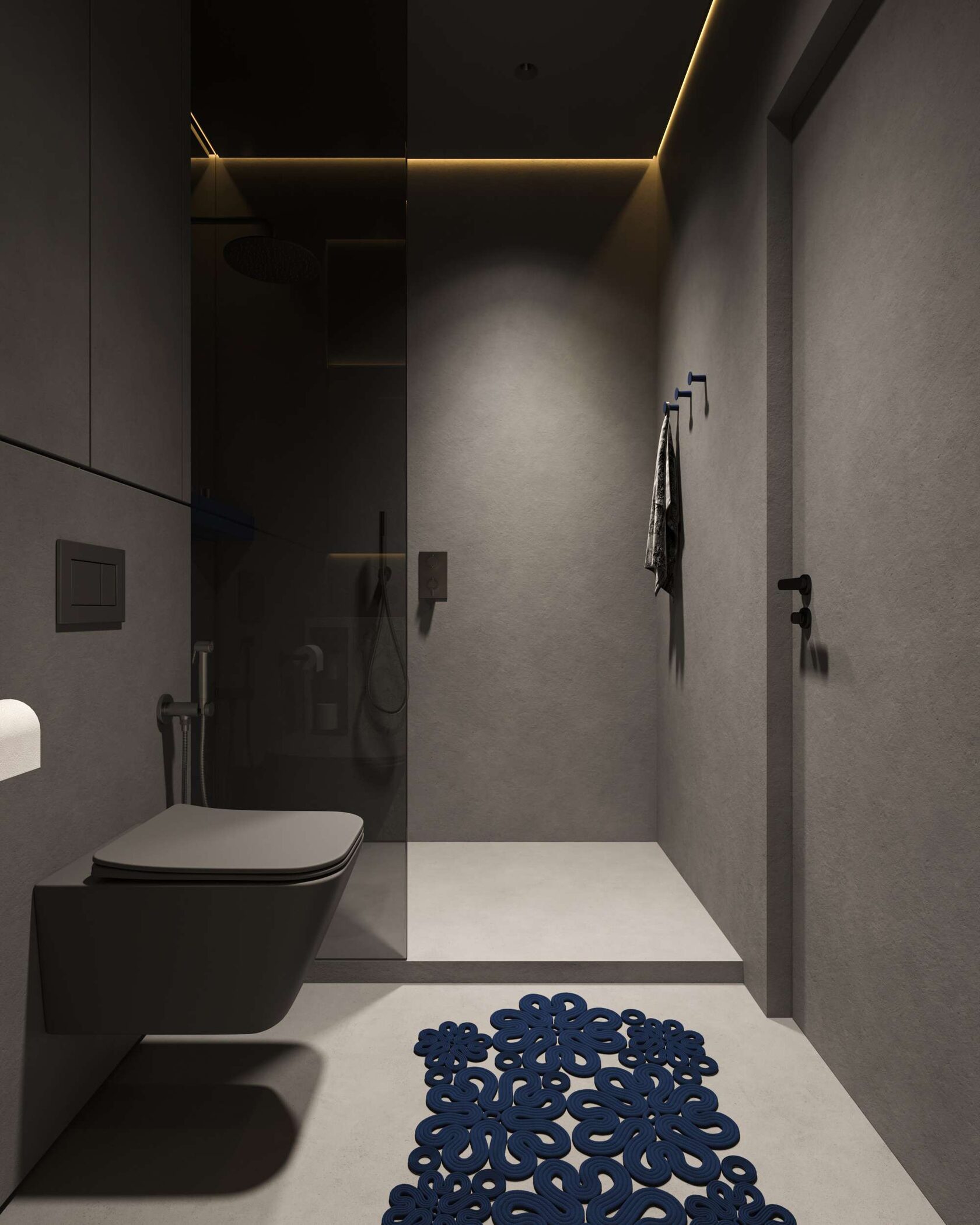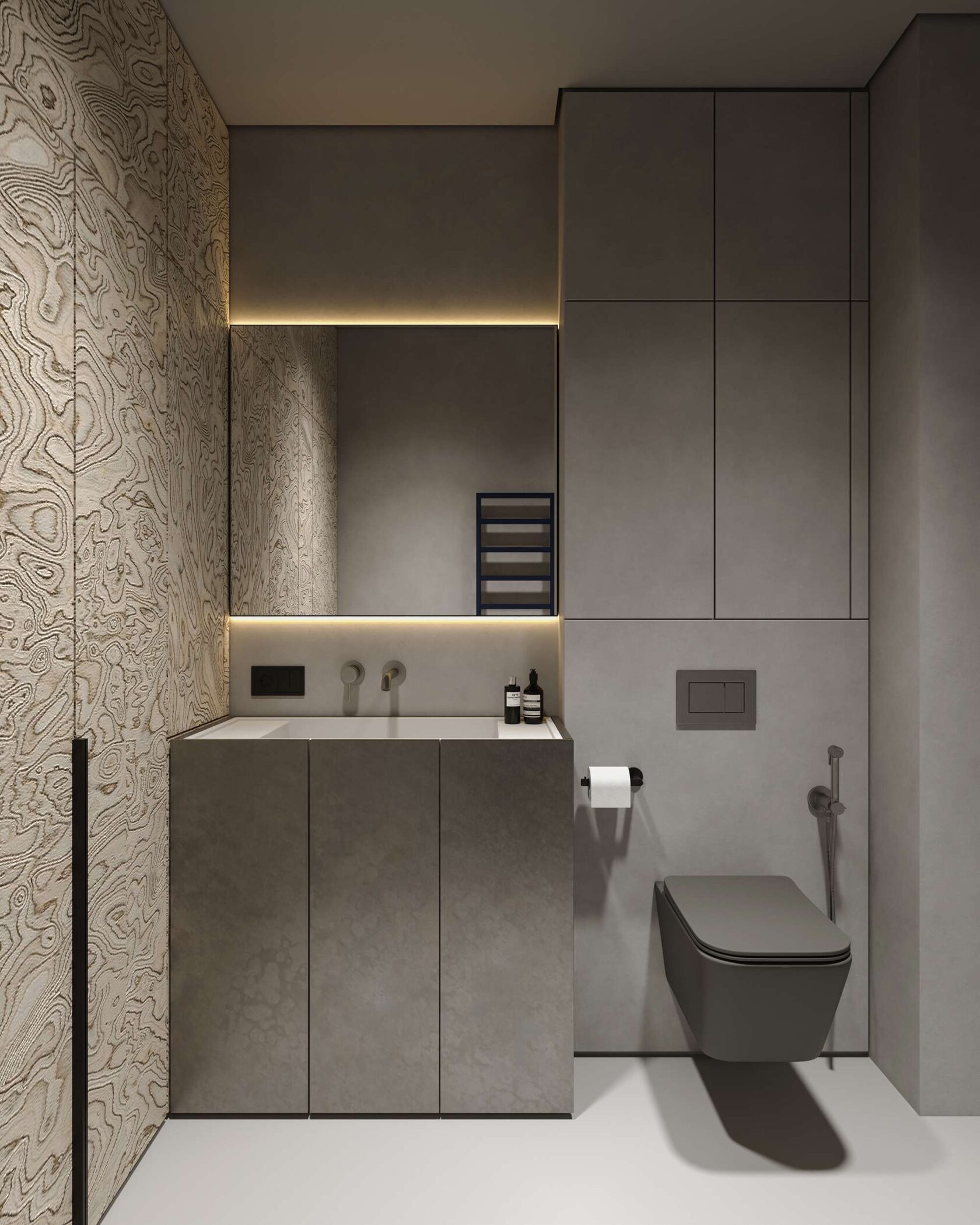 Ванная комната полностью отделана микроцементом, что