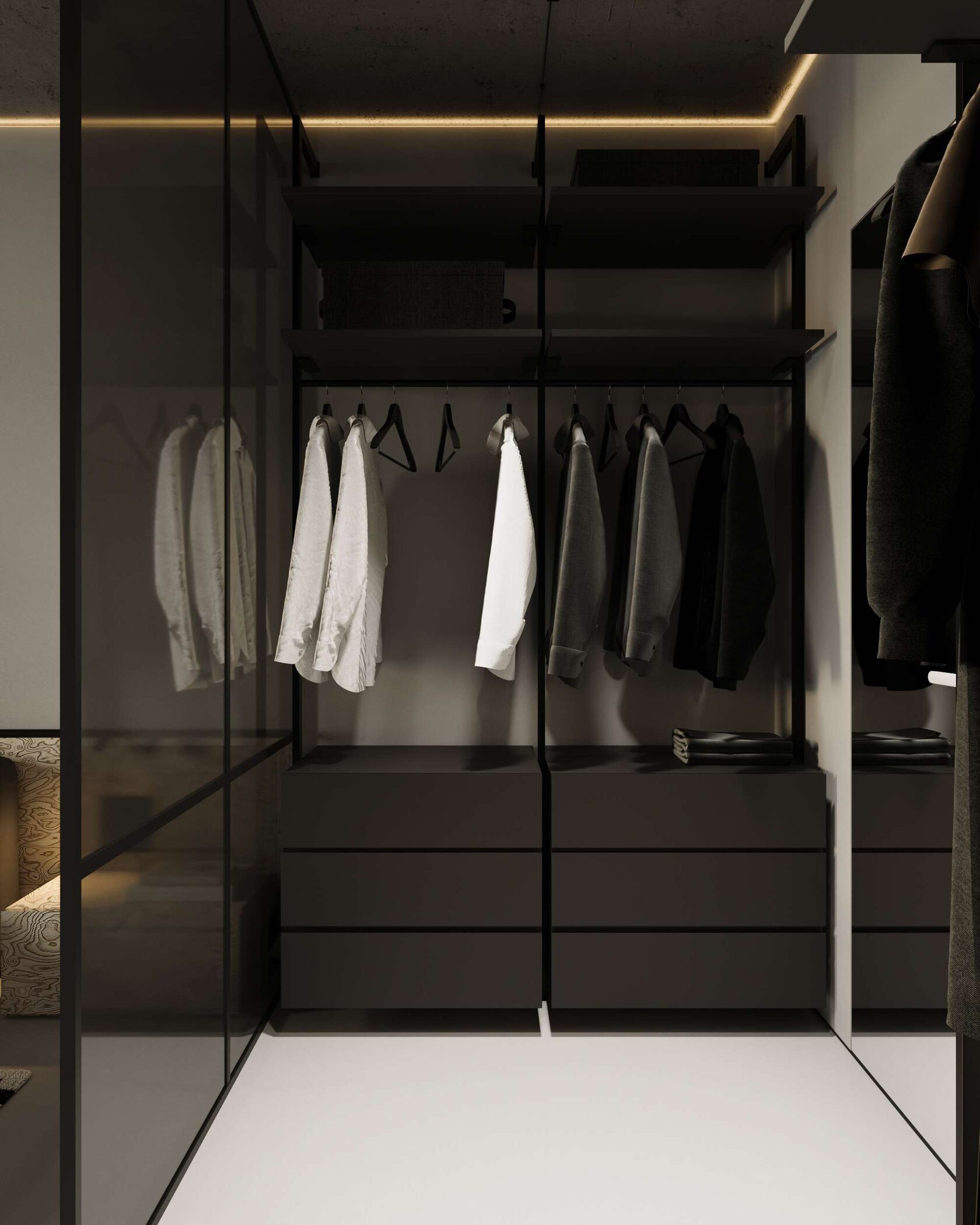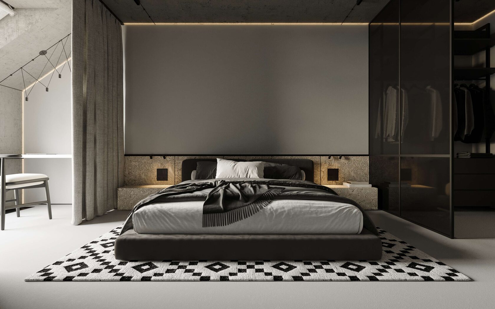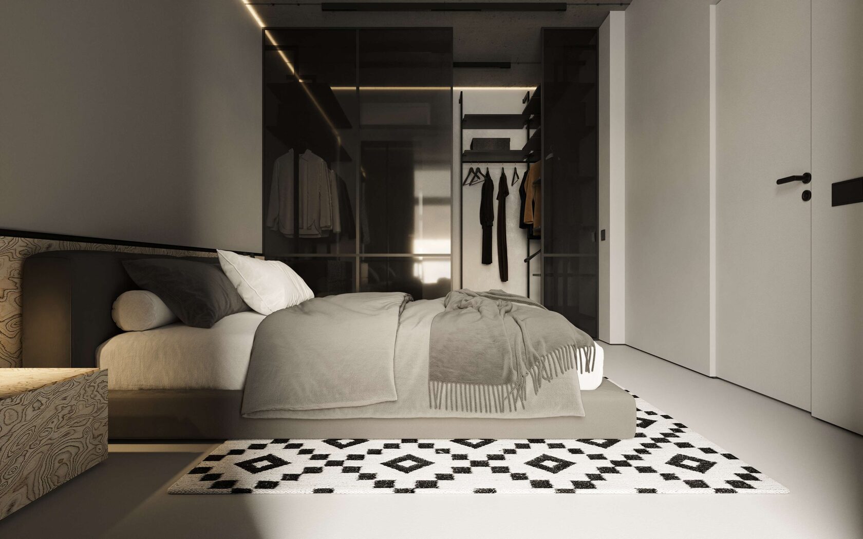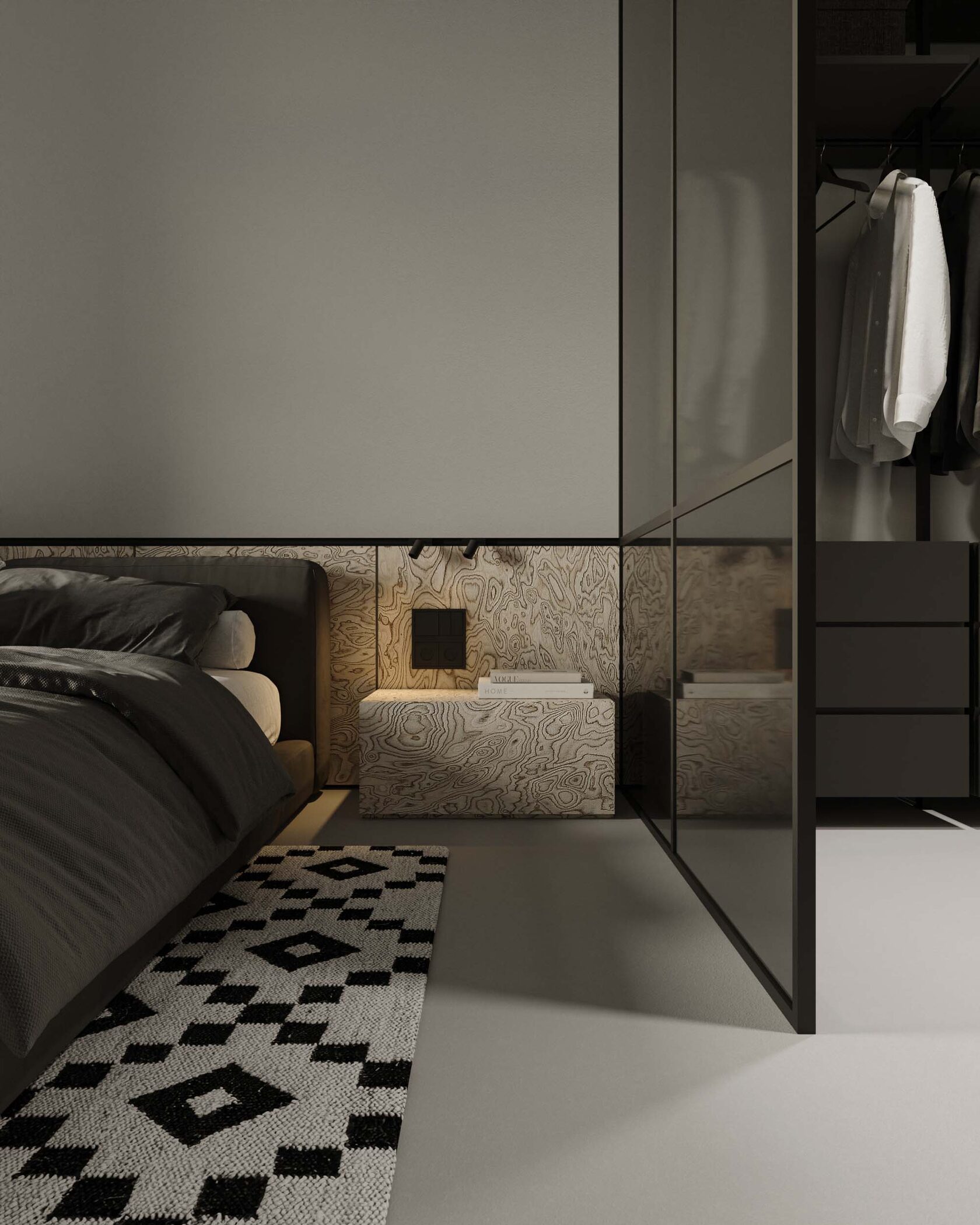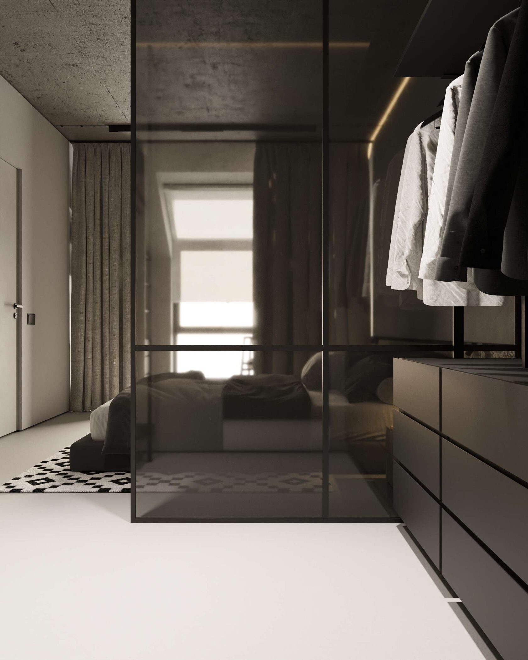 окна, гардеробная, выделенная стеклянной перегородкой, и спальная зона. Такой подход рацио-