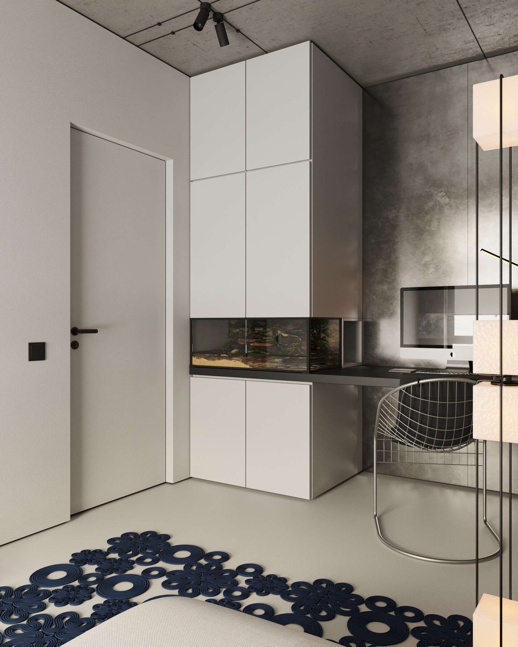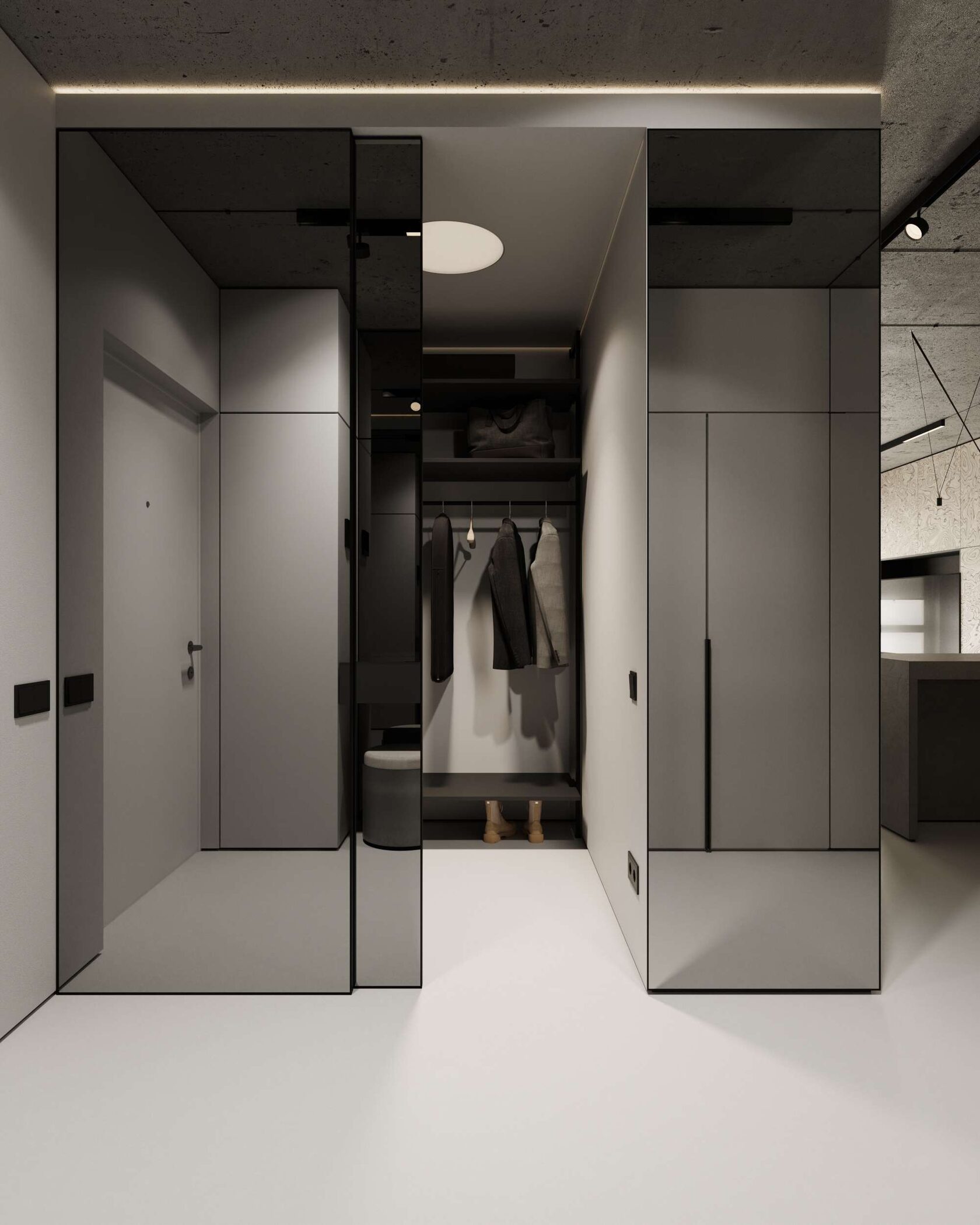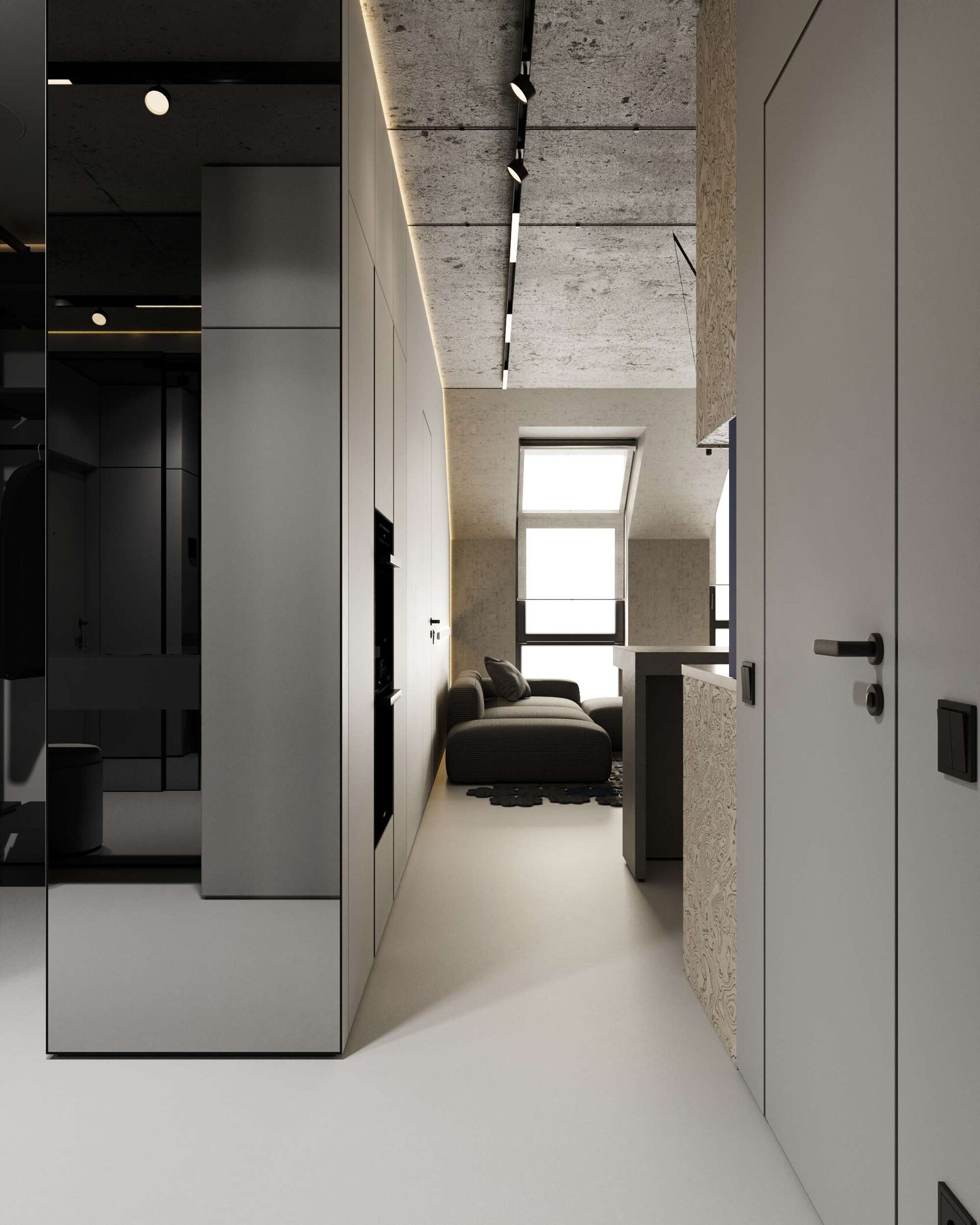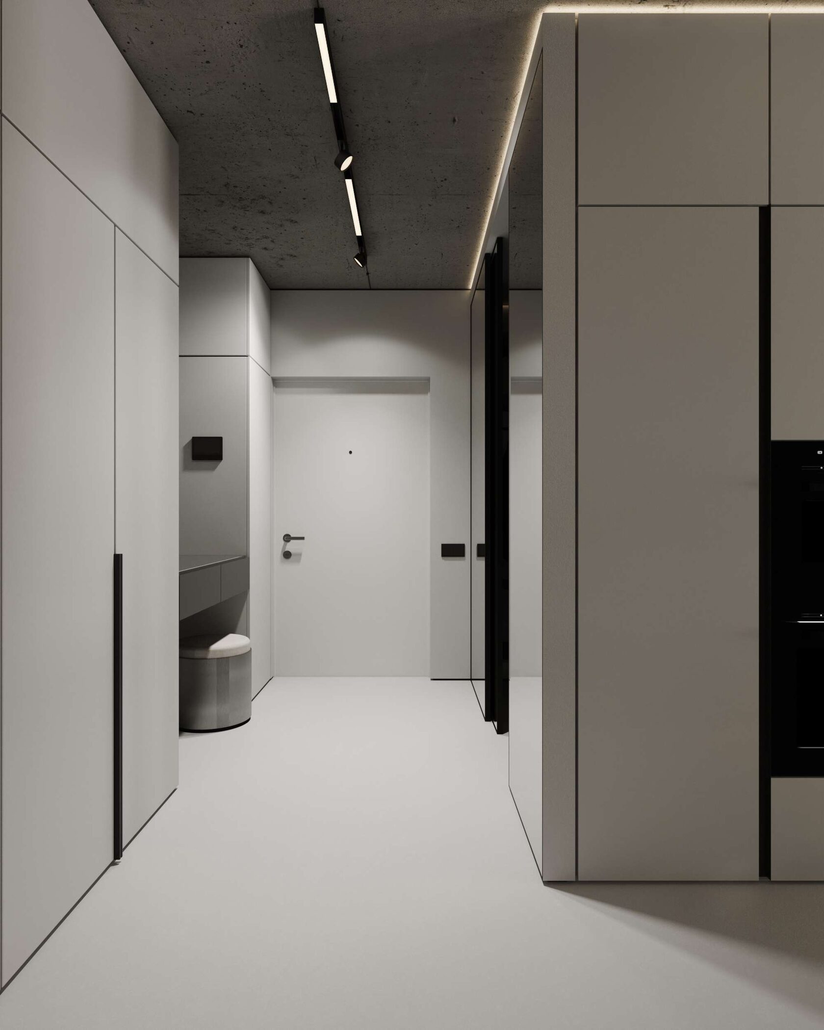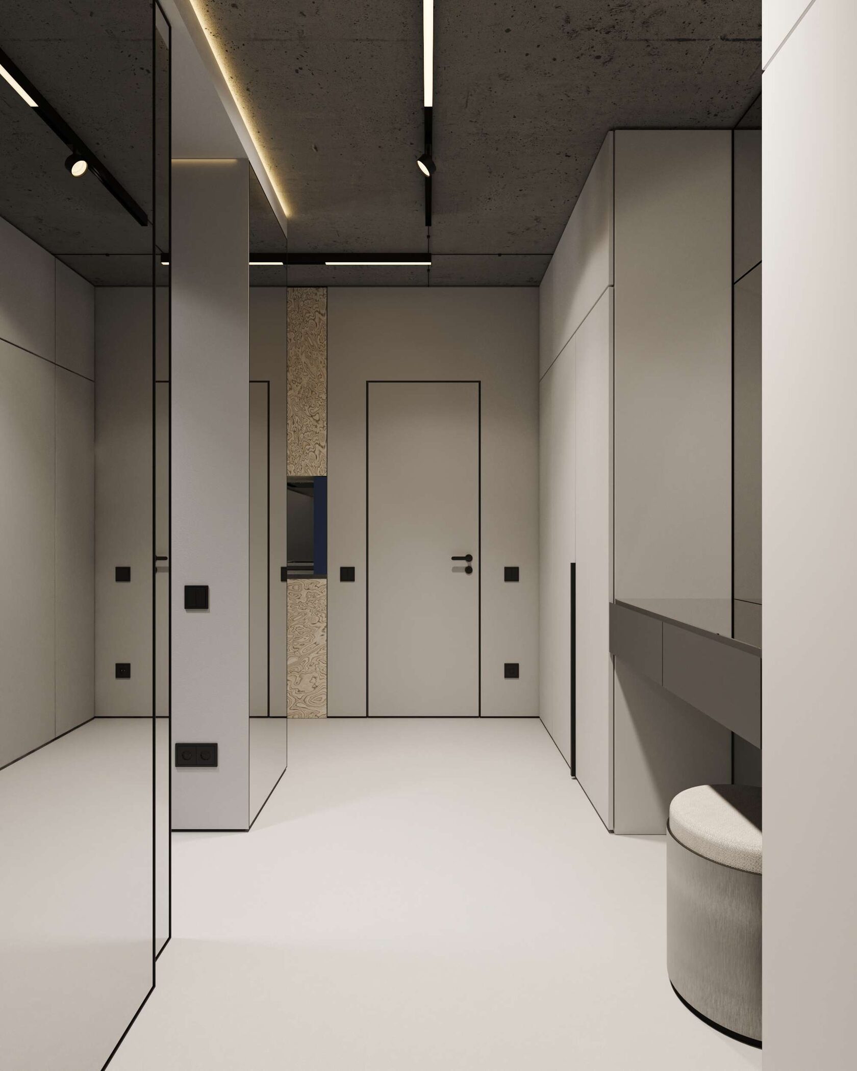 стены, микроцемент, бетон и скрытые двери со-