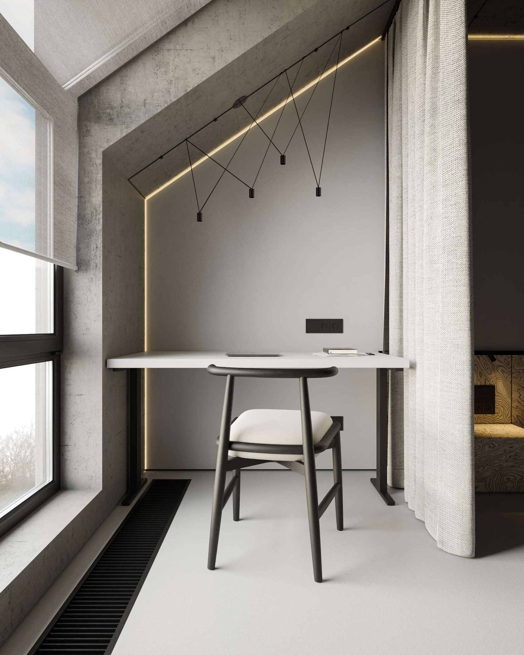 Рабочая зона в спальне интегрирована у мансардного