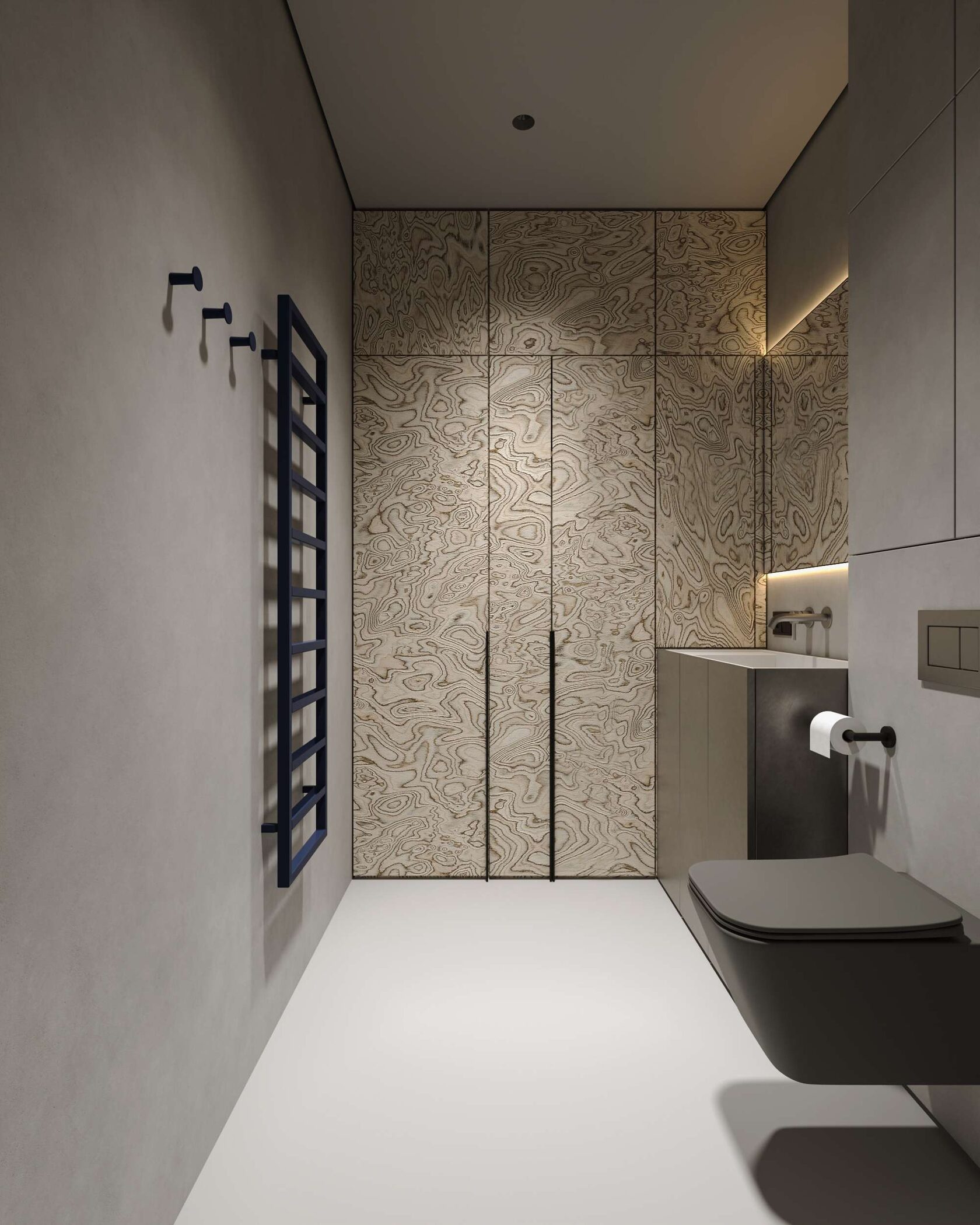 создает бесшовный минималистичный вид. Акценты из шпона корня дуба, синие элементы и ме-